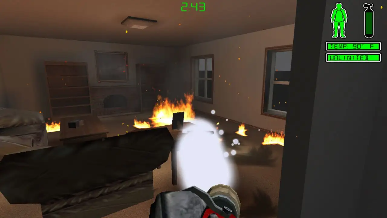Menggunakan perspektif orang pertama dan kontrol WASD, pemain menavigas lingkungan yang dipenuhi asap. Kamu juga akan dibekali perlengkapan seperti selang truk, penyemprot busa portable, alat pemadam CO₂, dan masih banyak lagi.