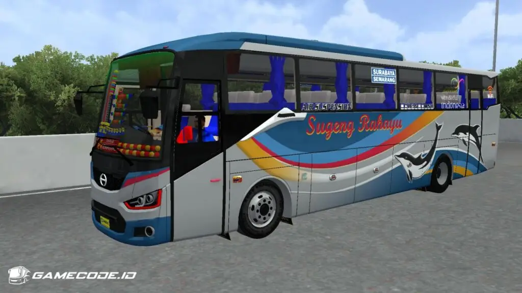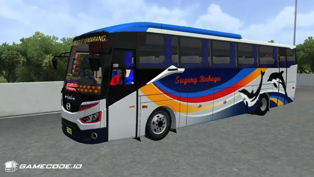 Livery-nya rame tapi enak dilihat, kombinasi biru tua, putih, dan aksen oranye–merah yang melengkung dari depan ke belakang, ditambah grafis lumba-lumba khas Sugeng Rahayu. Bagian depan tampil garang dengan wajah hitam-putih, lampu sipit dengan aksen merah di area headlamp, plus aksesoris dashboard yang penuh seperti bus AKAP beneran.