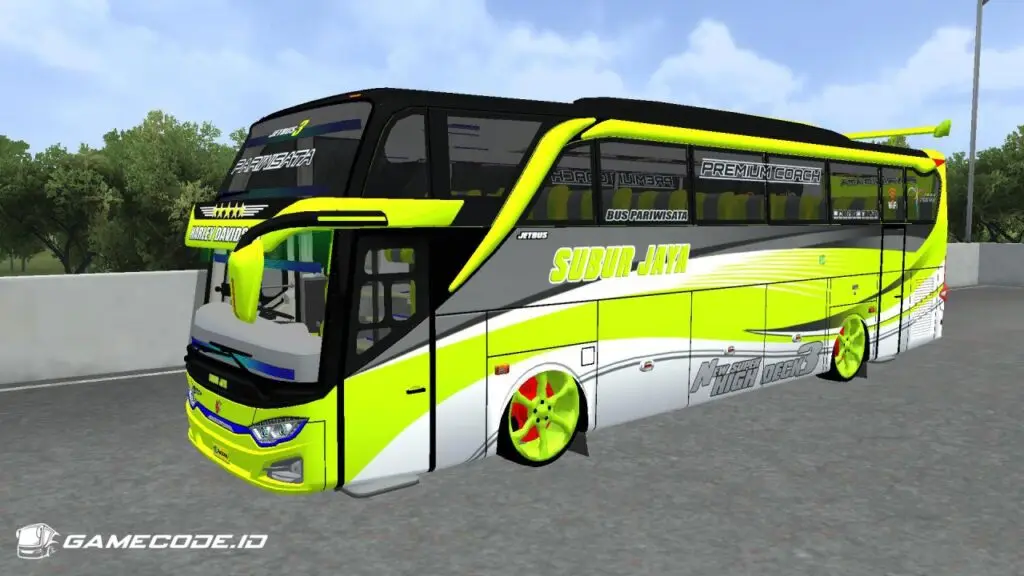 Sisi bawah punya deretan pintu bagasi panjang, jendela penumpang memanjang dengan tint gelap, dan di belakang ada area ventilasi mesin, jadi ini bus mesin belakang yang dibikin gaya racing cocok buat konten, konvoi, atau sekadar pamer tampilan.