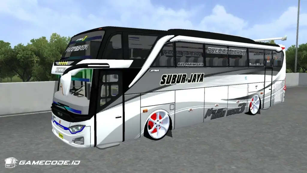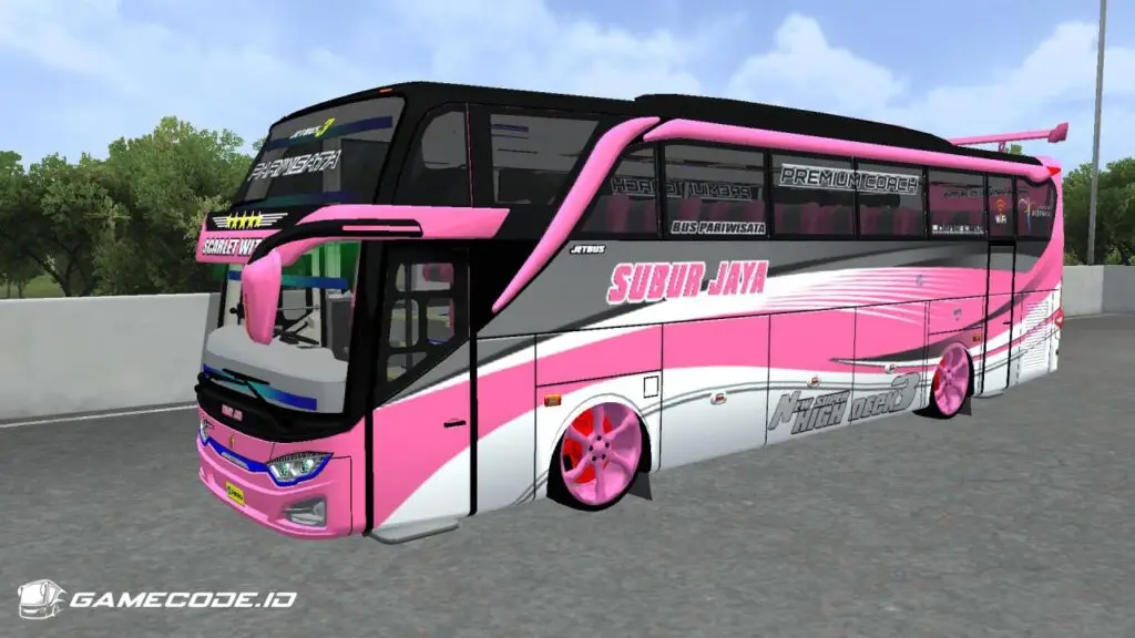 Mod JB3 SHD Racing buatan ZTOM ini paling pas buat bus SHD bergaya racing, bukan buat tampilan bus standar. Body-nya tinggi dan panjang, tapi dibuat terlihat ceper karena velg model sport besar dengan warna putih–merah dan jarak ban ke fender yang rapat.