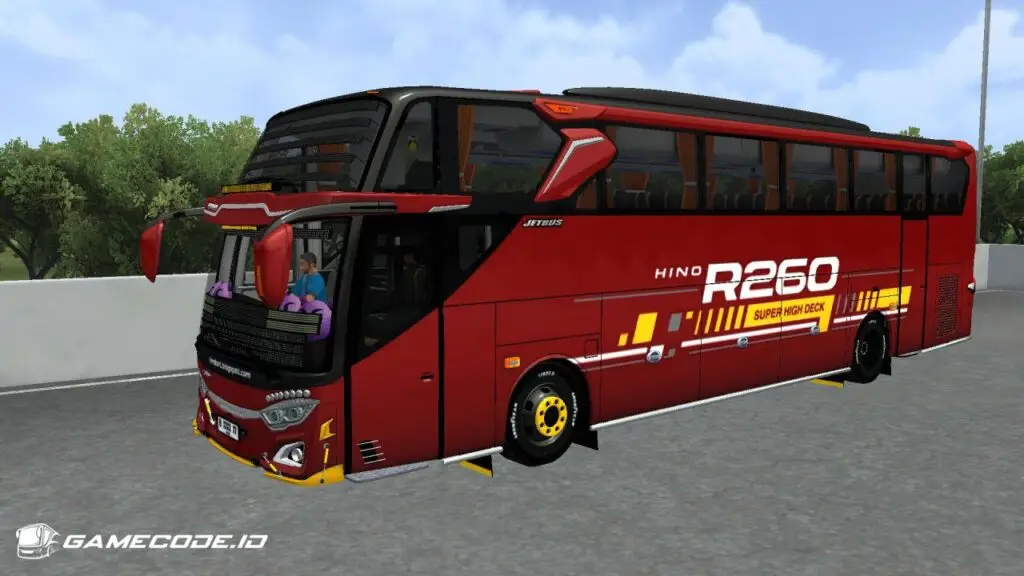 Warna merah tua dominan bikin bodinya kelihatan berani, lalu di sisi ada branding besar HINO R260 dengan tulisan Super High Deck, ditambah striping kuning-oren yang rapi sehingga temanya konsisten dari depan sampai belakang.