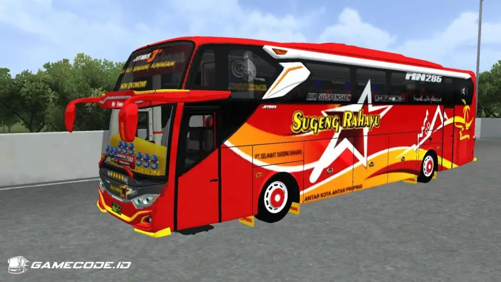 Tulisan Sugeng Rahayu dibuat besar di sisi, jadi identitas PO-nya kebaca jarak jauh, dan ada teks “Antar Kota Antar Provinsi” di bawah yang menegaskan bahwa mod ini dirancang untuk bus AKAP.