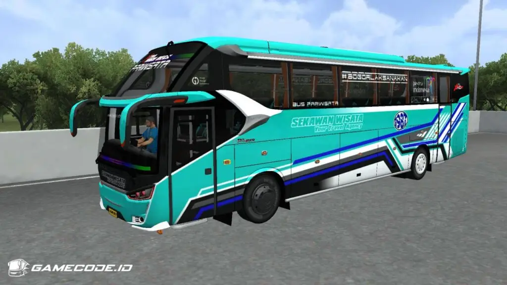 Mod SR2 Hino Gen 1 by MN Art x FA ini paling pas buat dipake pariwisataan. Warna toska-nya ngejreng tapi tetap enak dilihat karena dipotong aksen hitam di area kaca, lalu ditambah striping biru–putih yang tajam di sisi bawah.