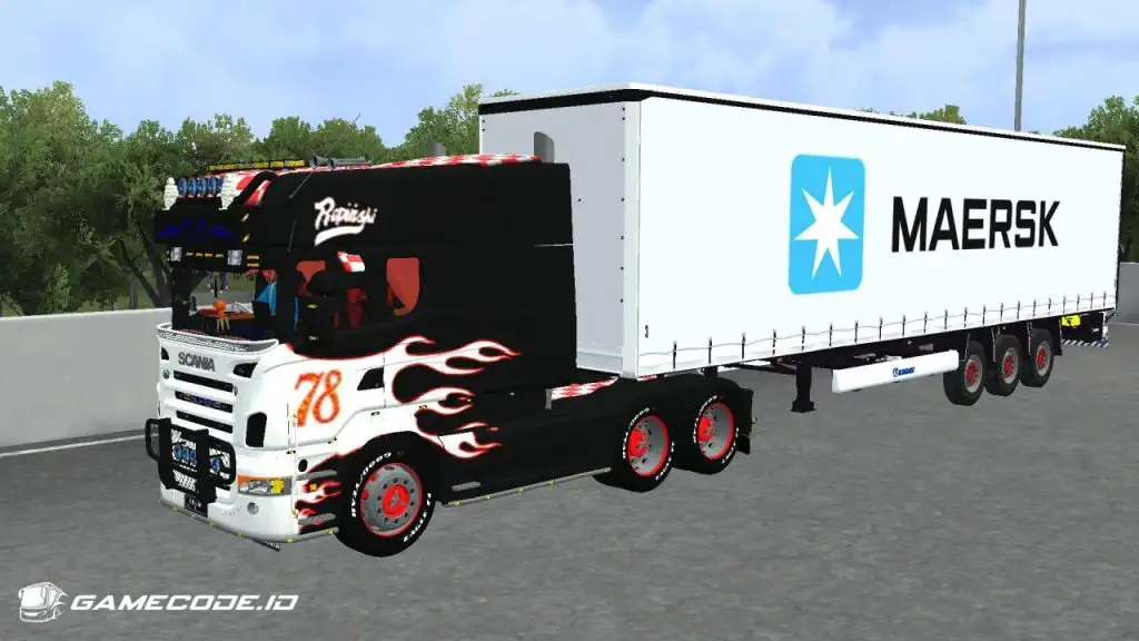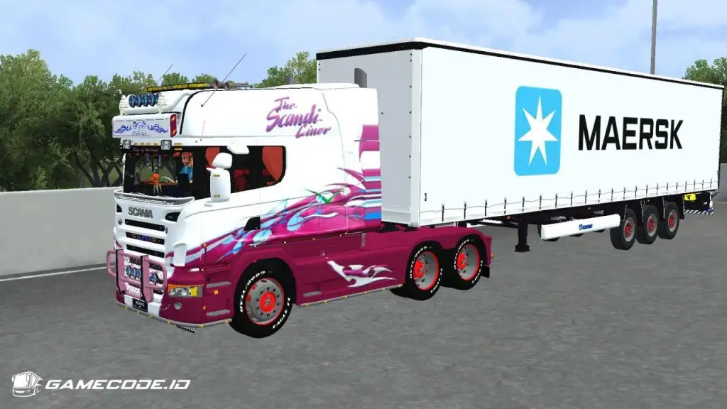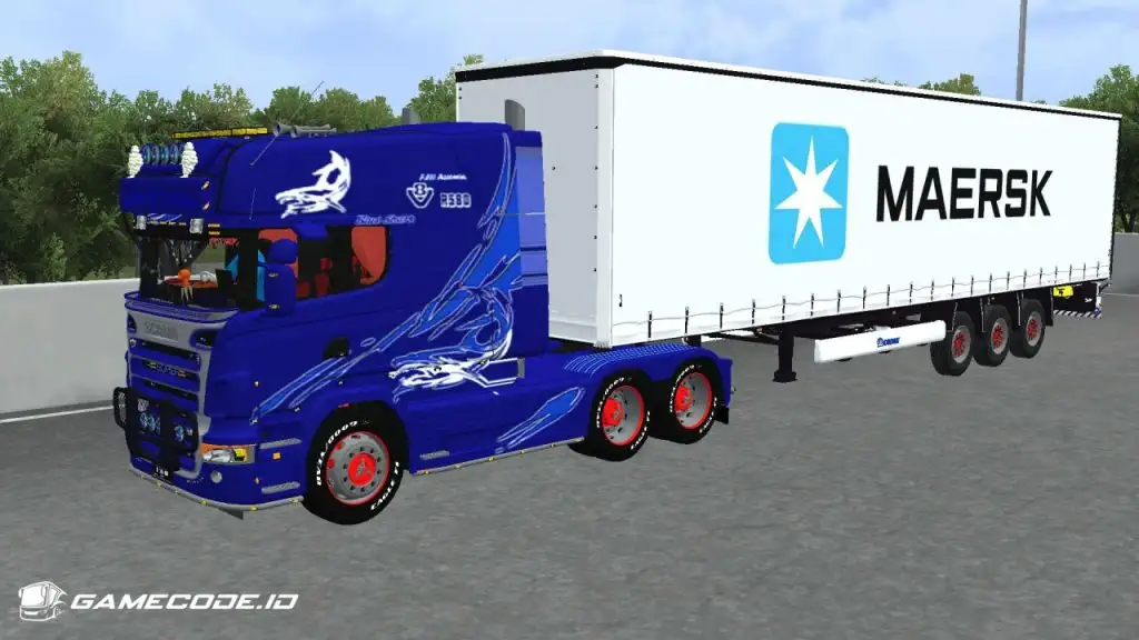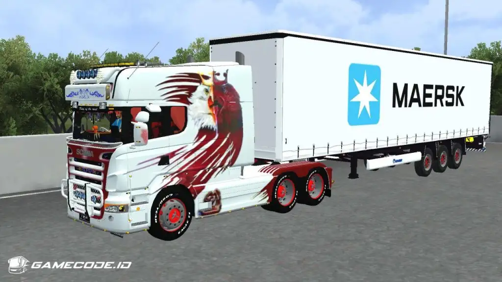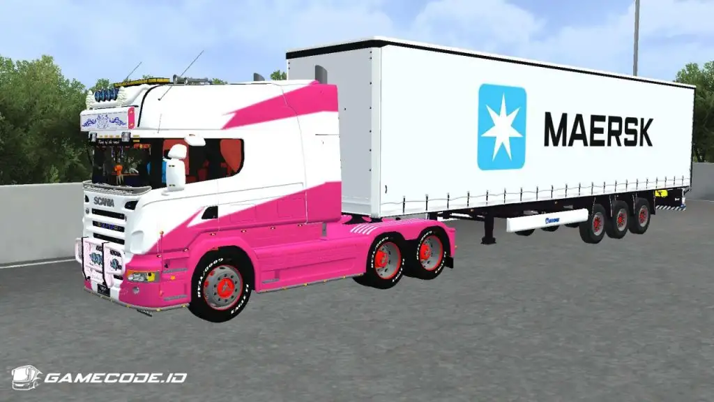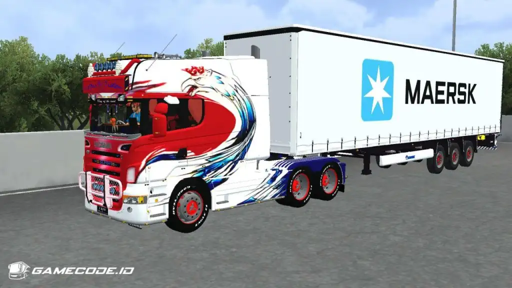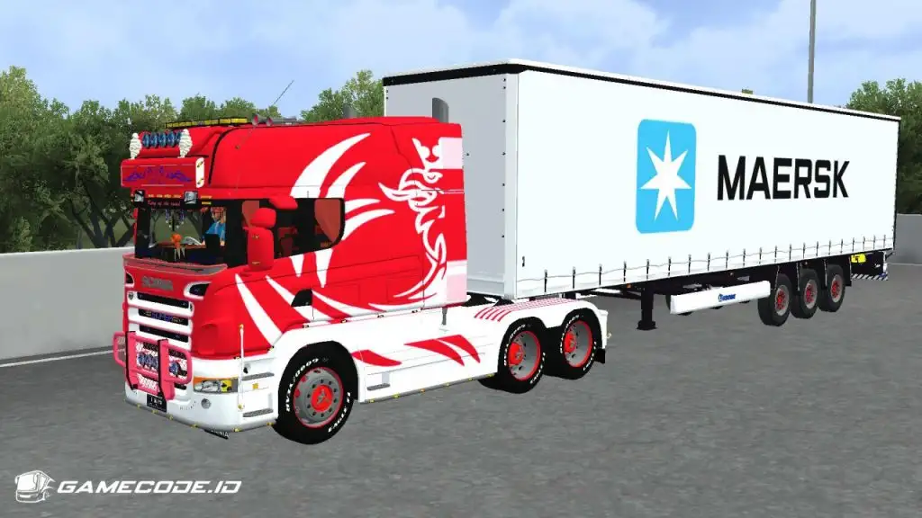 Trailernya menggunakan jenis boks berwarna putih dengan logo Maersk berukuran besar di bagian samping, menampilkan tampilan yang cukup familiar seperti yang biasa dijumpai dalam game ETS 2.
